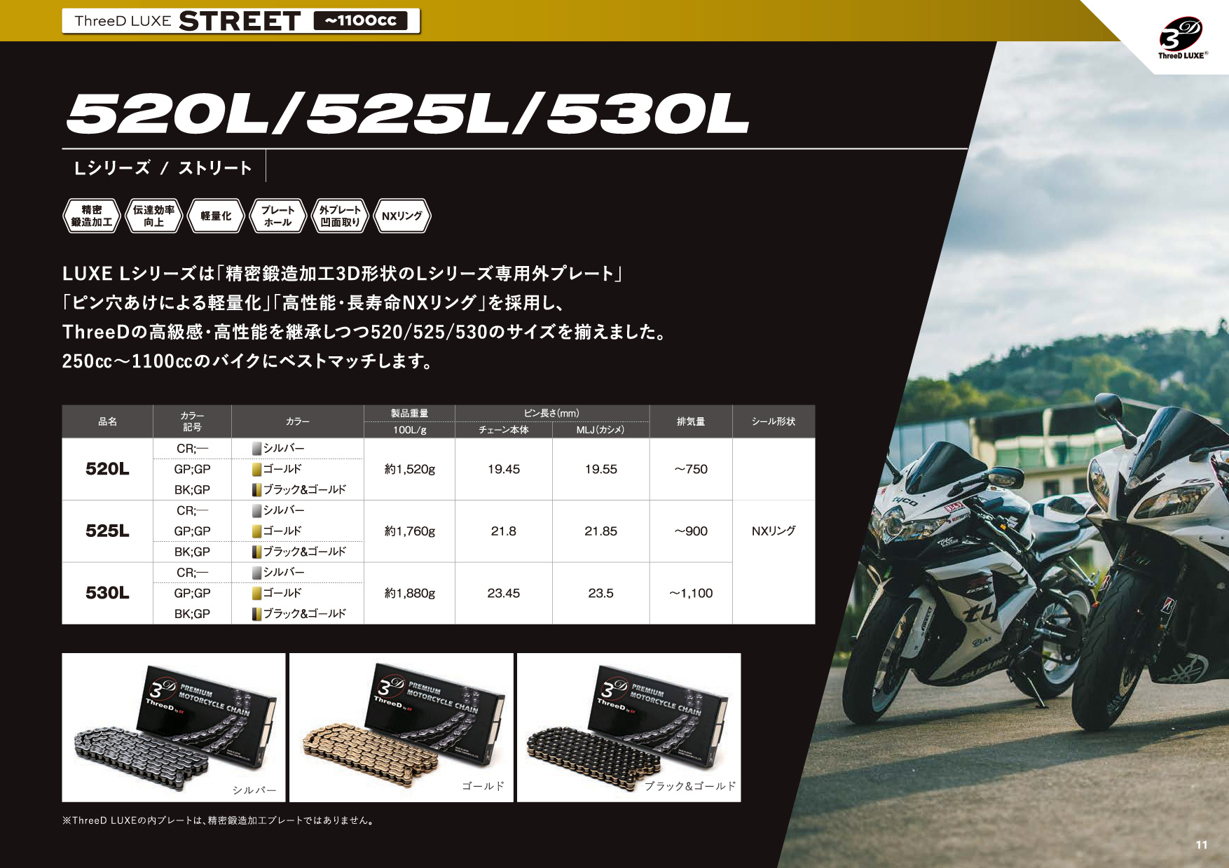 The ThreeD LUXE is a top-of-the-line chain designed specifically for street racing. It's ideal for supersport motorcycles ranging from 250cc to 1100cc.
