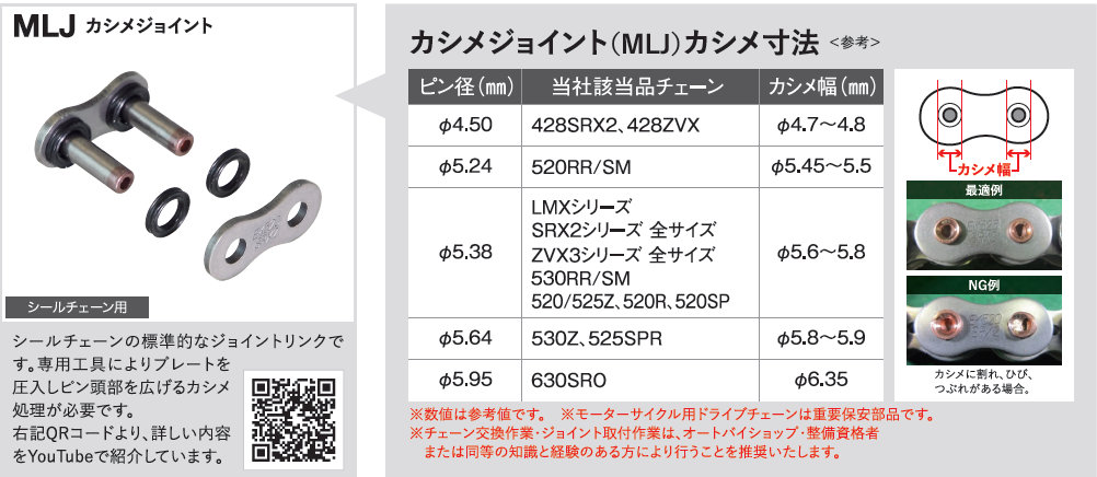 The chain links and pins are assembled using a crimp connection, which is the strongest connection method. Specifically designed for motorcycle applications, the MLJ crimp chain link is suitable for harsh transmission conditions with extremely high speeds and strong impacts. Installation requires special tools, but can be easily completed with EK's dedicated tools.