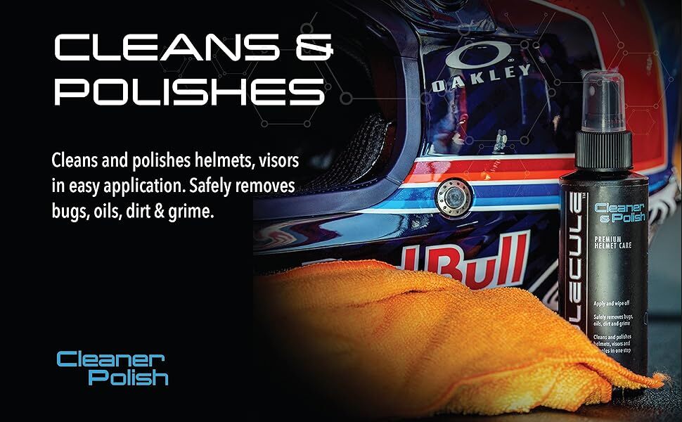 The MOLECULE CLEANER POLISH is designed to keep the exterior of your helmet clean, shiny and protected with one simple operation. Safe for use on face masks and glossy finishes, just spray and wipe on.