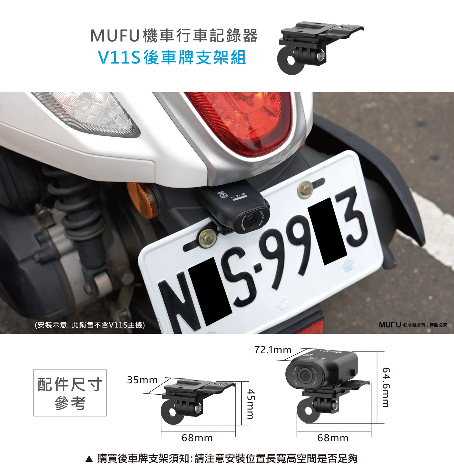 MUFU V11S / V11S PRO / V12S PRO 機車行車記錄器配件 - 後車牌支架組,