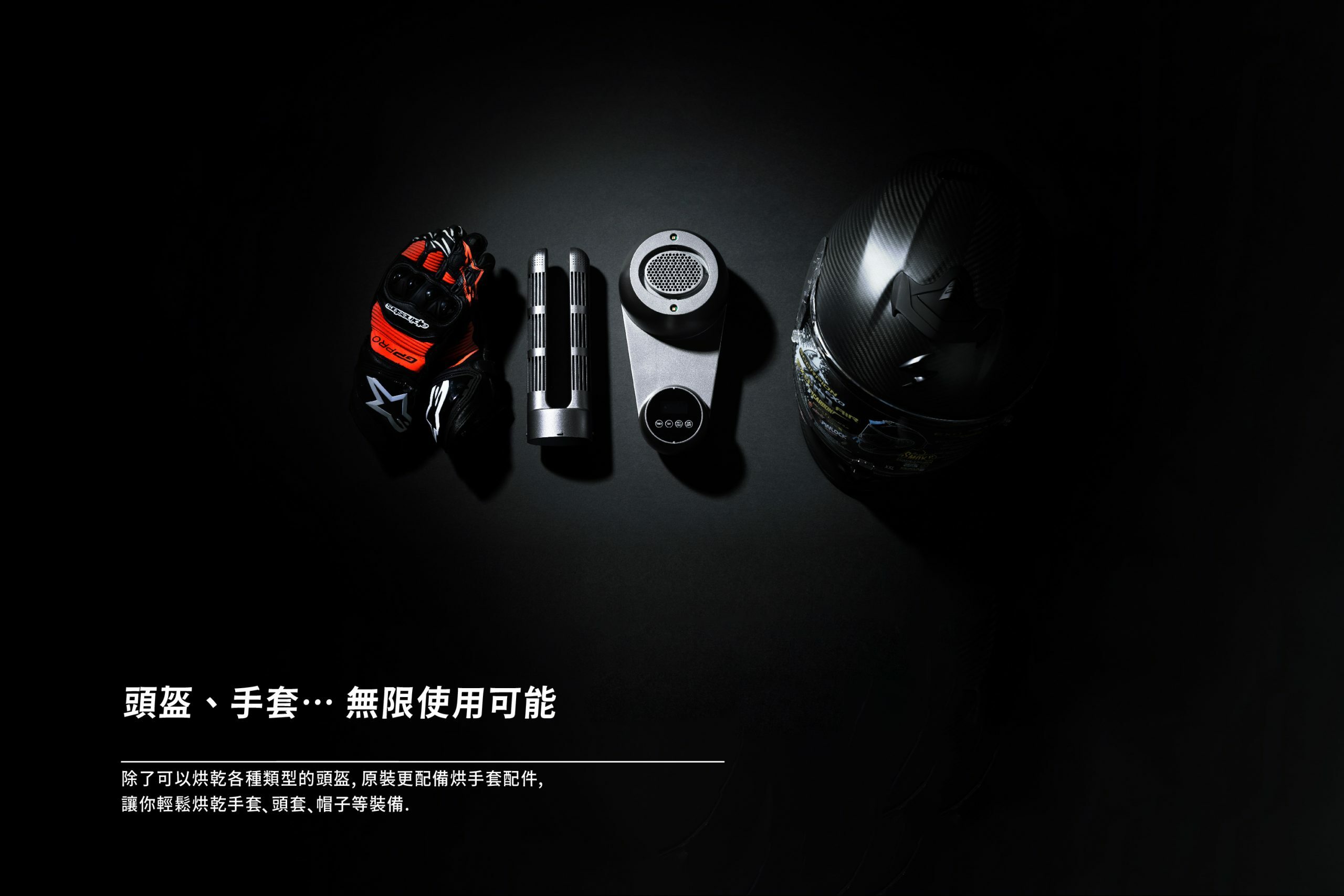 除了可以烘乾各種類型的頭盔,原裝更配備烘手套配件,讓你輕鬆烘乾手套、頭套、帽子等裝備。只要你能放好,它都能為你烘乾、除菌、消臭!