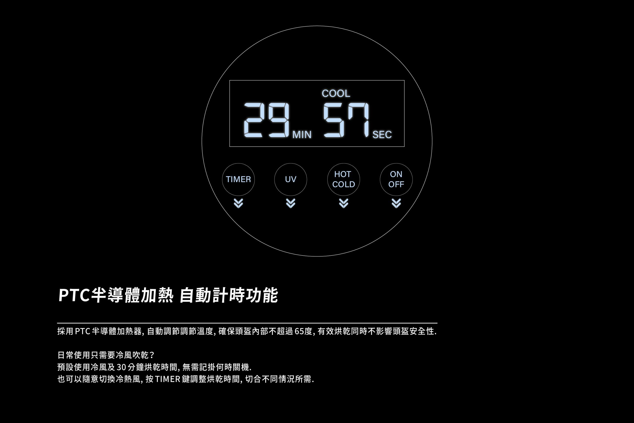 日常使用只需要冷風吹乾?預設使用冷風及30分鐘烘乾時間,無需記掛何時關機。也可以隨意切換冷熱風,按TIMER鍵調整烘乾時間,切合不同情況所需。